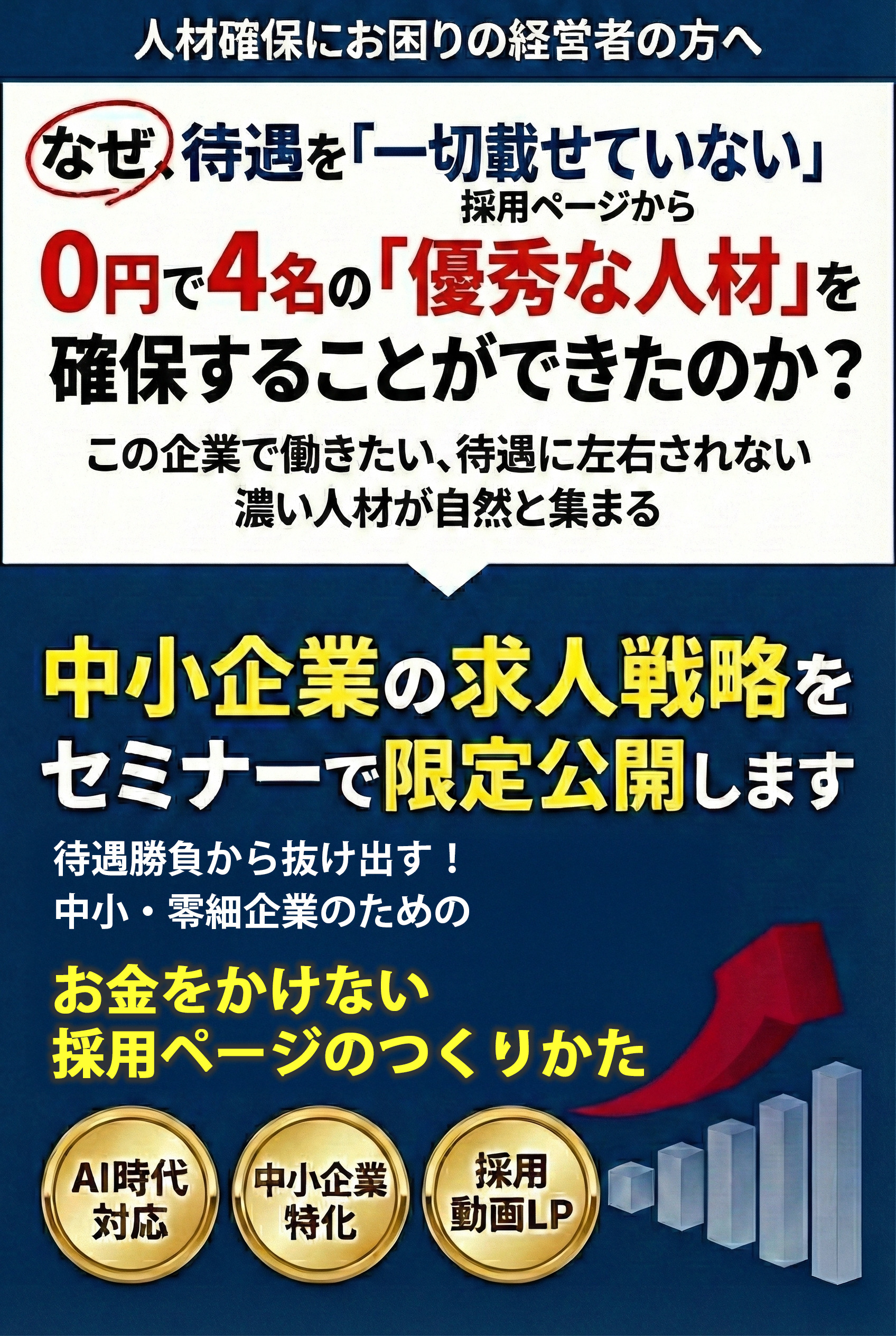 90%以上の経営者が、ホームページ(HP)やポータルサイトに求人広告で「待遇」を前面に出しています。
